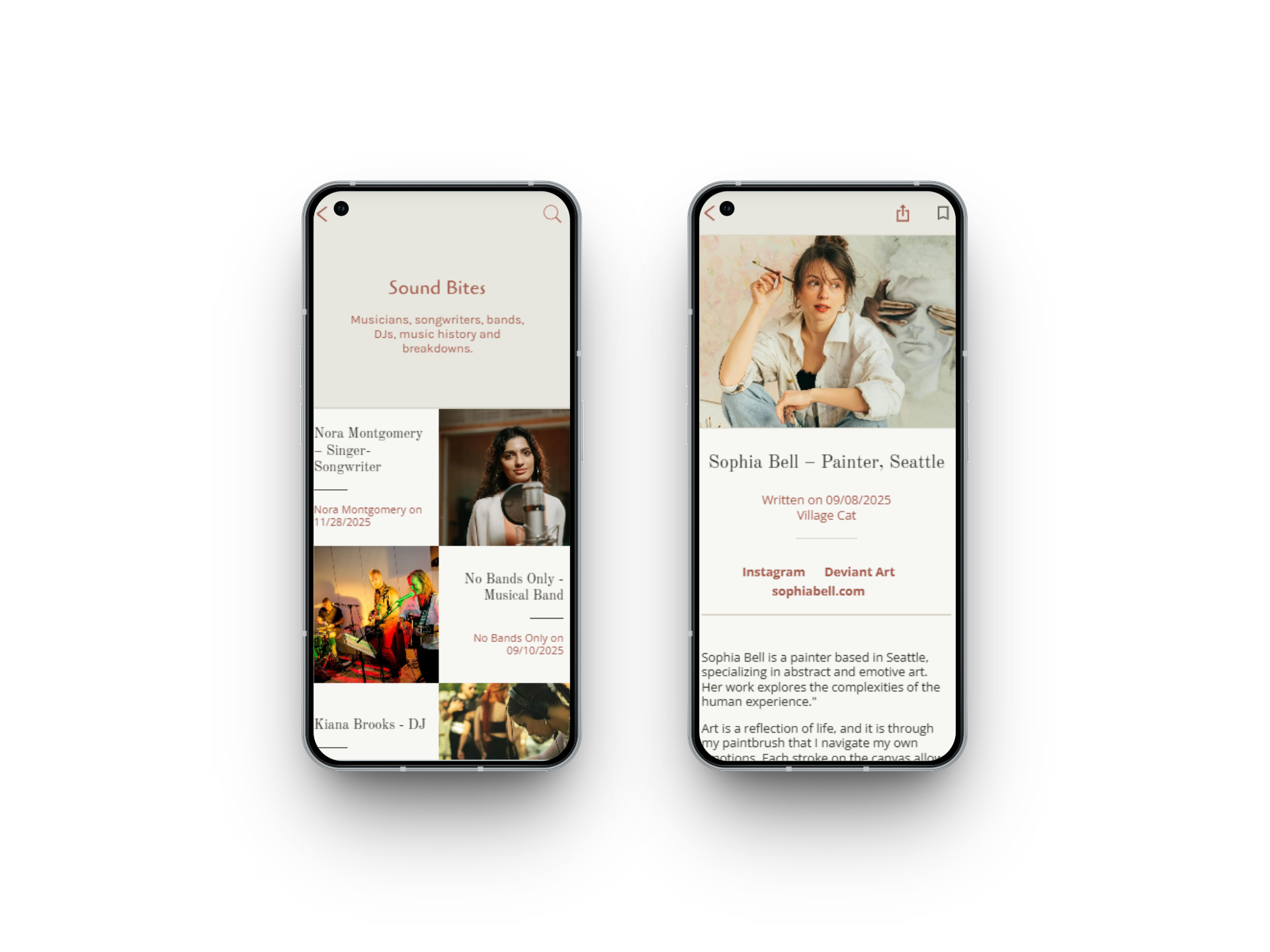 Village Cat Creatives' sectionsEach submission is featured within a curated section of the app. Choose the category that best fits your work.Arts SpeaksVisual and hand-crafted work.